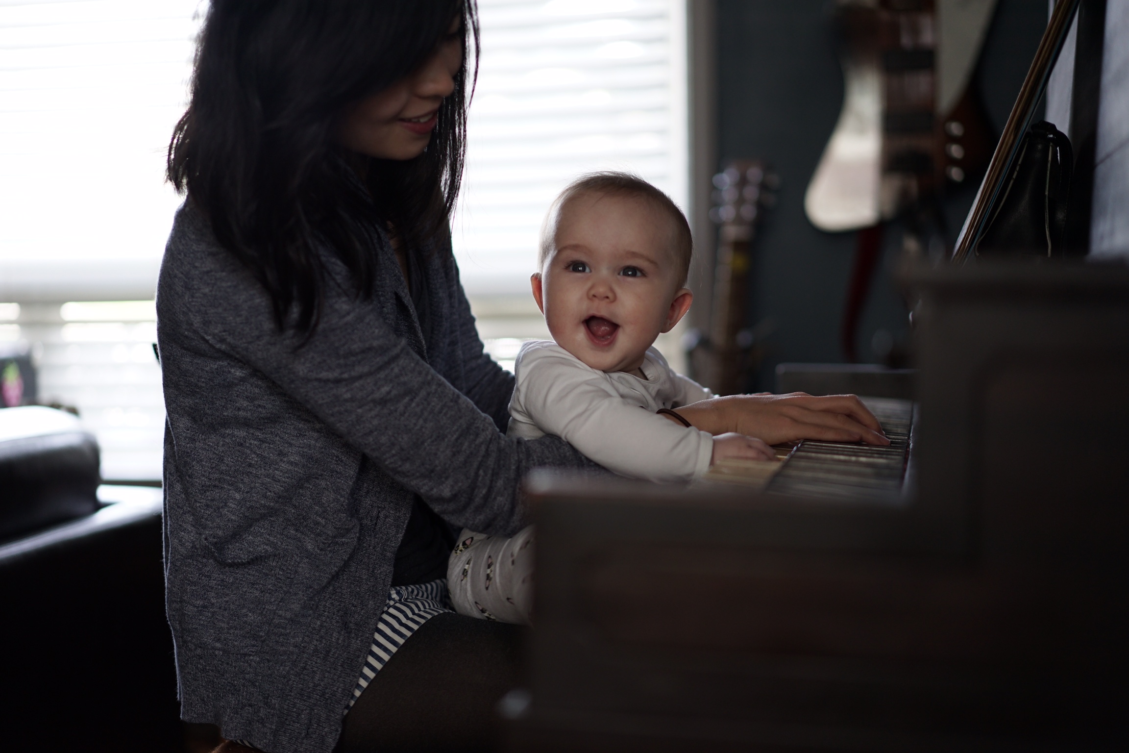 Though we’re all more ambitious and enthusiastic after a morning nap, it’s not quite the same as a cup of coffee. While Cody fills up the French press and feeds the dogs, Bowie and I head to the piano. She excitedly reaches for the keys before we’re even seated on the bench. Her hands move beside my fingers, and for songs she really likes, she kicks her legs, smiles, and sings with me.